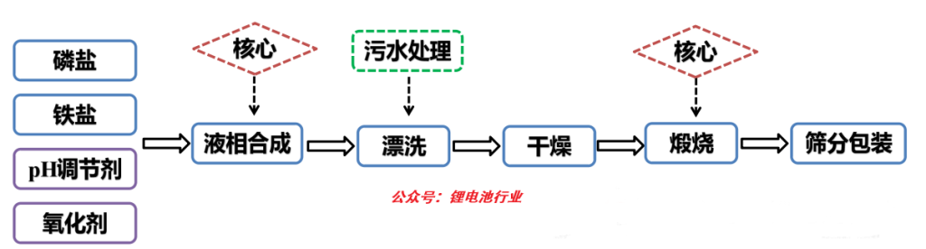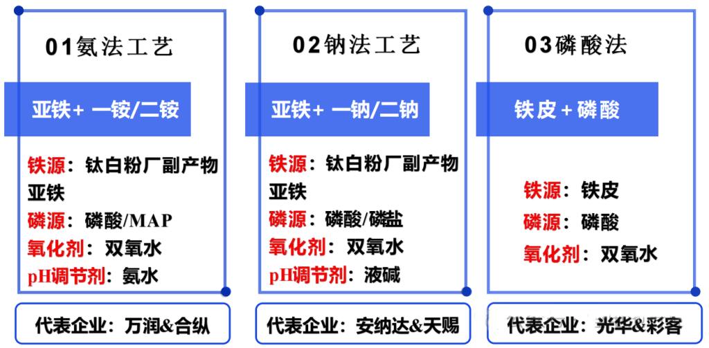 目前磷酸铁的合成工艺路线主要有三种方法,氨法、钠法、磷酸法。