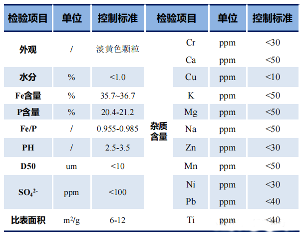 具体包括:水分测试、Fe含量测试、P含量测试、Fe/P测试、pH值、粒度分布(D50等)、比表面积、杂质元素含量、硫酸根含量。