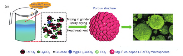 原理:通过掺杂金属(如Mg²+、Al³+、Ti⁴+)或非金属(如N、S)离子,改变晶体结构,扩大锂离子扩散通道。