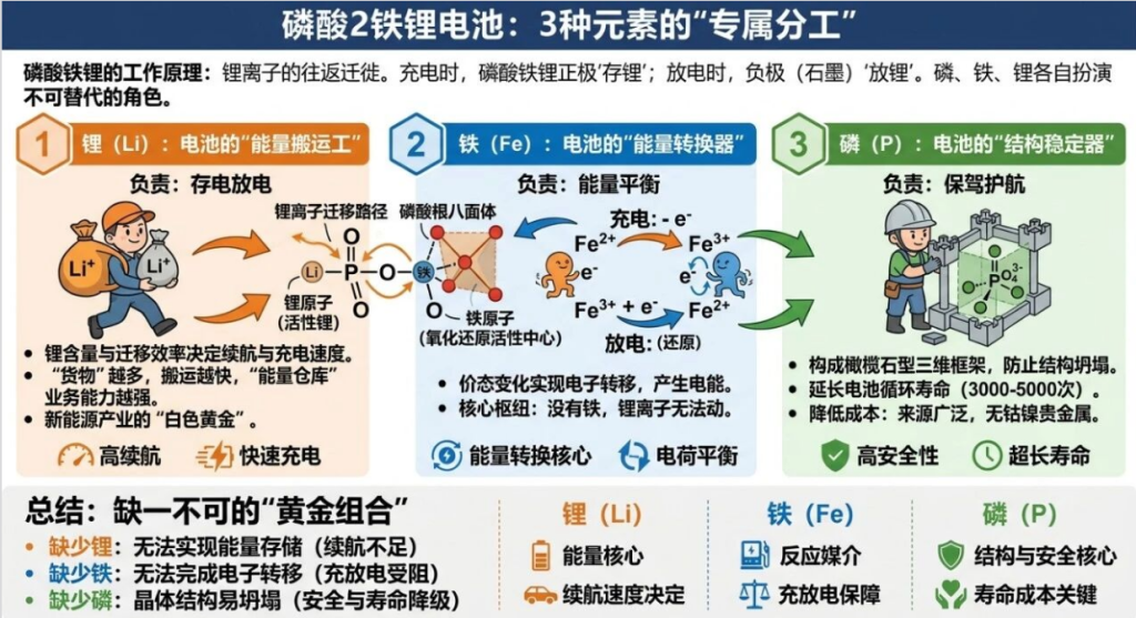 - 铁提供电子转移通道,保障电化学反应可逆进行,是 “反应媒介”,负责能量的转换和电荷平衡,保障电池能正常充放电,同时提升安全性;;