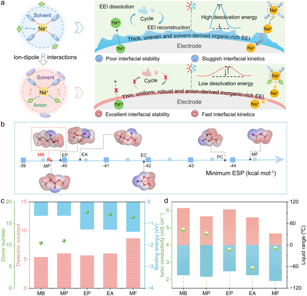图1.电解液设计。(a)常规电解液与含弱配位羧酸酯的阴离子增强电解质在极端温度下的界面性质示意图。(b)碳酸亚乙酯(EC)、PC、MB、MP、EP、EA和MF溶剂的电势密度。(c)羧酸酯溶剂的供体数量、介电常数和与Na+的结合能比较。(d)混合电解液在25°C和常用羧酸酯溶剂的液体范围内的离子电导率。