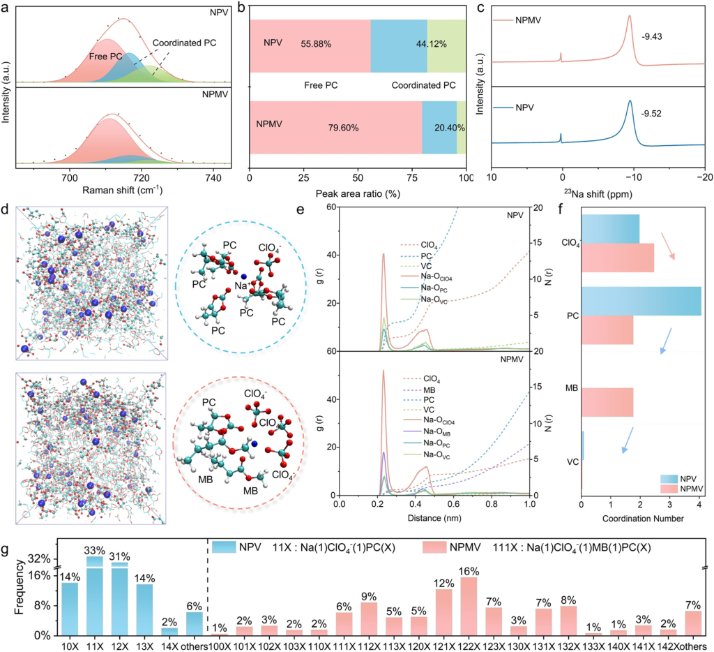 图2.溶剂化结构。(a)拉曼光谱和(b)NPV和NPMV电解液中自由/配位PC的相应比例。(c)23NaNMR光谱。(d)根据MD模拟计算出的溶剂化结构快照。(e)NPV和NPMV 电解液的径向分布函数和配位数。(f)阴离子/溶剂的汇总配位数。(g)从MD模拟观察到的NPV和NPMV 电解液中的内部溶剂化构型分布。