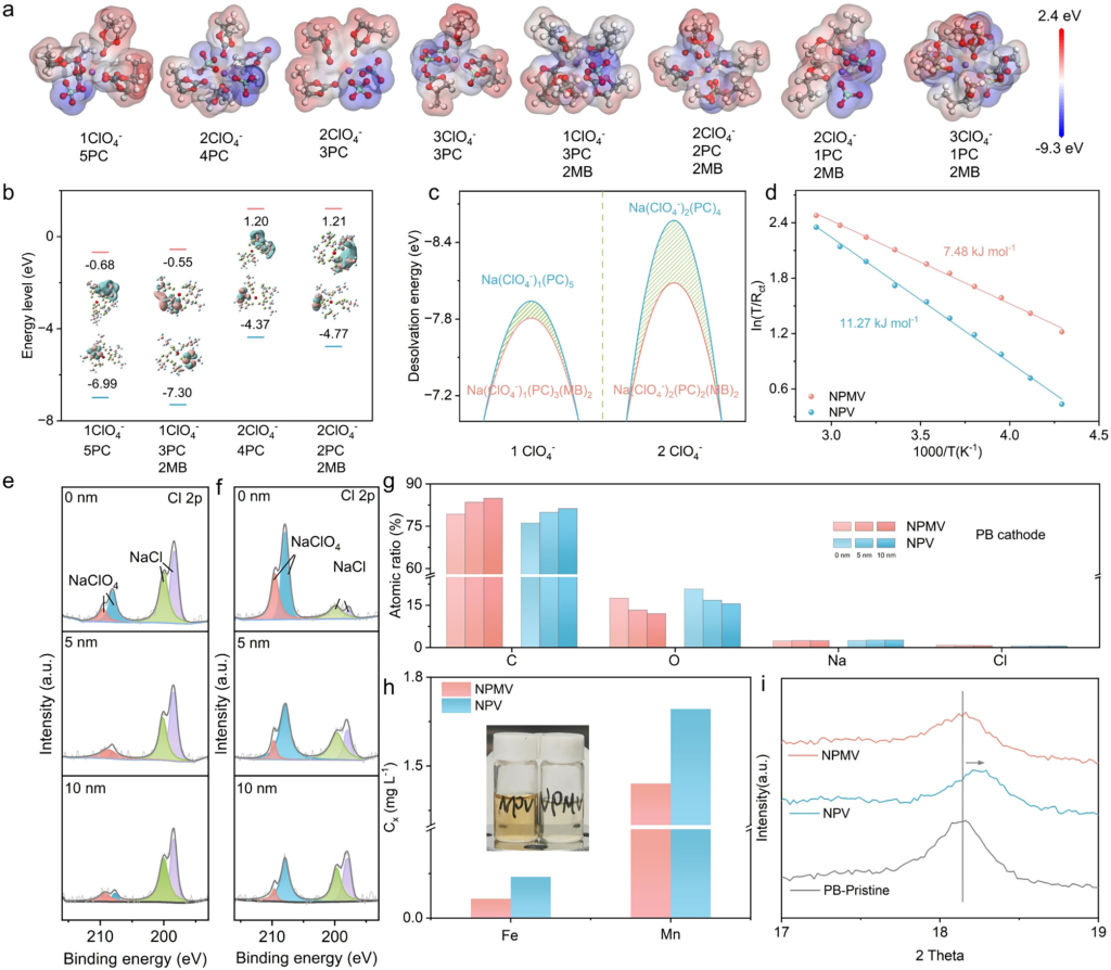 图3.界面特性。(a)电势密度分布,(b)HOMO/LUMO能级,以及(c)代表性溶剂化构型的脱溶能。(d)变温EIS中的Na+脱溶能。(e)NPMV和(f)NPV电解质中Cl2p的XPS。(g)PB正极上CEI的元素含量。(h)循环NPMV和NPV电解液中过渡金属离子的含量。(i)原始和循环PB正极的XRD。