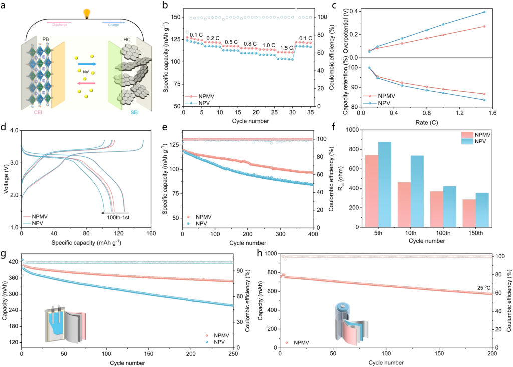 图4.室温电化学性能。(a)PB||HC全电池示意图。(b)PB||HC纽扣电池的倍率性能及相应的(c)过电位和容量保持率。(d)PB||HC纽扣电池在1.0C下的充放电曲线和(e)循环性能。(f)长期循环过程中的放电电阻。PB||HC(g)软包电池和(h)圆柱形电池的长期循环性能。