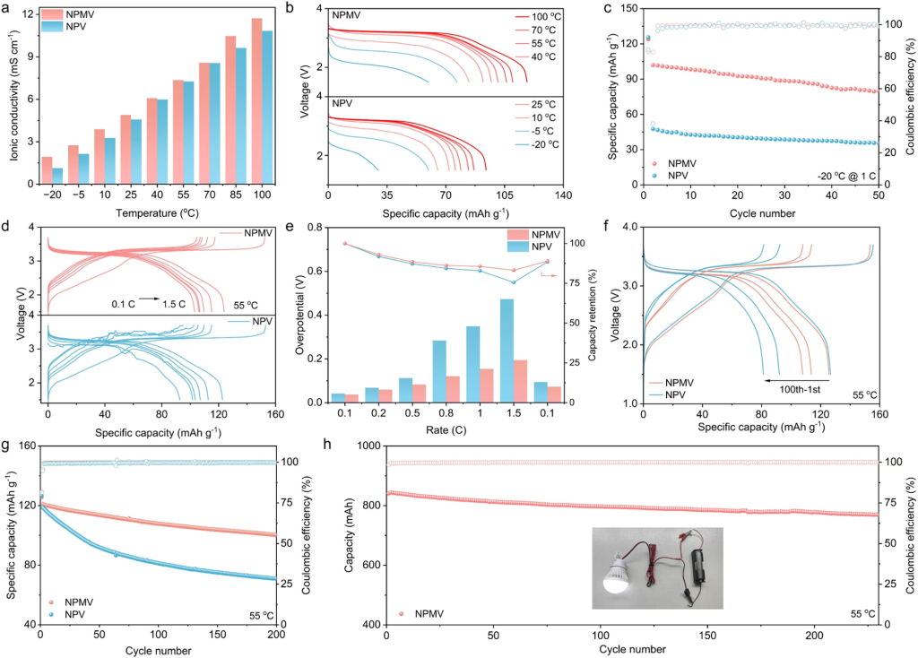 图5.变温电化学性能。(a)变温离子电导率。(b)PB||HC纽扣电池在1.0C下从100到−20°C的放电曲线。(c)PB||HC电池在25°C下充电并在−20°C下放电的长期循环。(d)PB||HC纽扣电池在55°C下速率性能期间的充电放电曲线和(e)相应的过电位和容量保持率。(f)PB||HC纽扣电池在55°C下的充电放电曲线和(g)相应的长期循环性能。(h)PB||HC圆柱形电池在55°C下的长期循环性能。