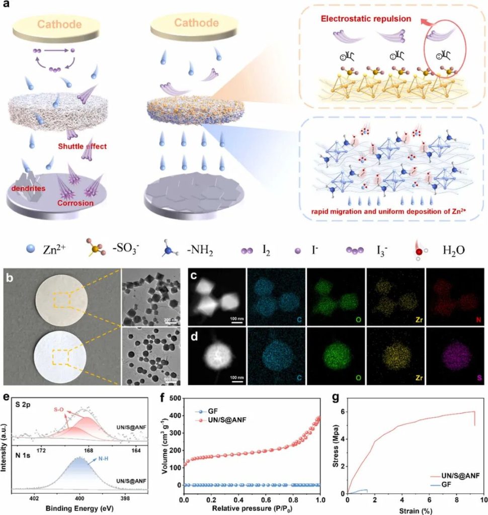 图1.UN/S@ANF隔膜的机理图解及表征。(a)UN/S@ANF隔膜的机理图。(b)UN/S@ANF隔膜的光学和TEM图。(c)UN/S@ANF隔膜阳极侧和(d)UN/S@ANF隔膜正极侧的元素映射图。(e)S2p和N1 s的高分辨率XPS。(f)GF和UN/S@ANF隔膜的氮吸附/解吸等温线和(g)拉伸应力-应变曲线。
