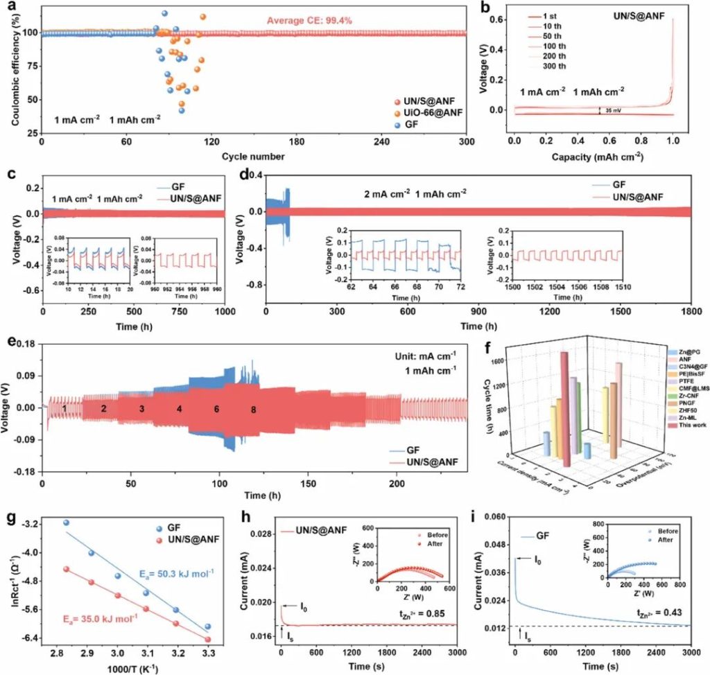 图2.半电池的电化学性能。(a)采用UN/S@ANF、UiO-66@ANF和GF隔膜的Zn||Cu电池的库仑效率;(b)采用UN/S@ANF隔膜的Zn||Cu电池在1mAcm−2和1mAhcm−2时的容量-电压曲线。Zn||Zn电池的循环性能:(c)1mAcm−2和1mAhcm−2,(d)2mAcm−2和1mAhcm−2。(e)采用UN/S@ANF和GF隔膜的Zn||Zn对称电池的倍率性能。(f)本研究与其他报道的研究对Zn||Zn电池循环性能进行了电化学比较。(g)通过阿伦尼乌斯方程计算的UN/S@ANF和GF隔膜的脱溶活化能。(h)UN/S@ANF、(i)和GF隔膜的Zn2+迁移数。