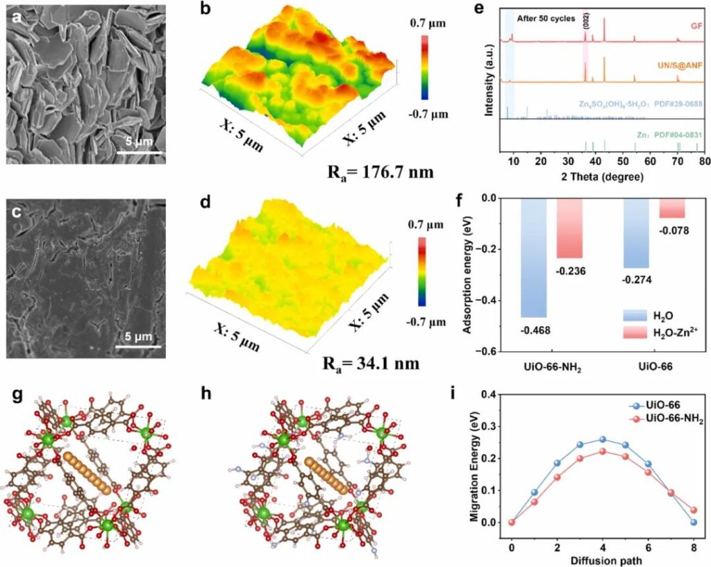 图3.Zn负极的沉积形貌和MD模拟。(a)SEM图和(b)使用GF隔膜的Zn||Zn电池经过50次循环后Zn负极的AFM图。(c)SEM图和(d)使用UN/S@ANF隔膜的Zn||Zn电池经过50次循环后Zn负极的AFM图。(e)50次循环后Zn||Zn电池的Zn负极的XRD。(f)H2O和H2O-Zn2+在UiO-66-NH2和UiO-66上的吸附能值。(g)UiO-66和(h)UiO-66-NH2晶格结构中的Zn2+离子迁移路径。(i)UiO-66和UiO-66-NH2特定路径中Zn2+离子的迁移能量值。