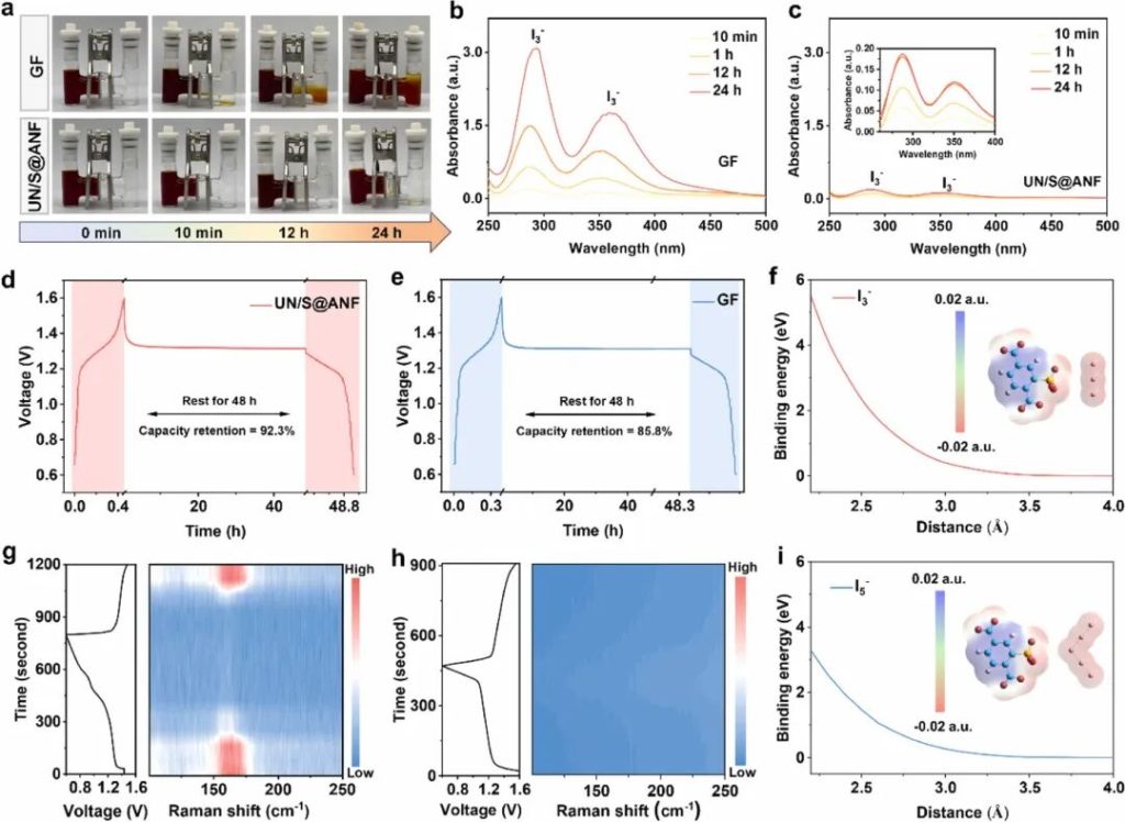 图4.多碘化物抑制穿梭效应的测量。(a)GF和UN/S@ANF隔膜的I3-溶液在H型玻璃电池中产生的视觉穿梭效应的光学图像。H型电池右腔中2MZnSO4的紫外可见曲线,用于确定(b)GF和(c)UN/S@ANF隔膜中I3-浓度随时间的变化。(d)UN/S@ANF隔膜和(e)GF隔膜的自放电曲线。UiO-66-SO3H与(f)I3-和(i)I5-的结合能,插图对应于UiO-66-SO3H与I3-和I5-离子的静电表面势。(g)GF和(h)UN/S@ANF隔膜在恒流充放电过程中I3-的原位拉曼。
