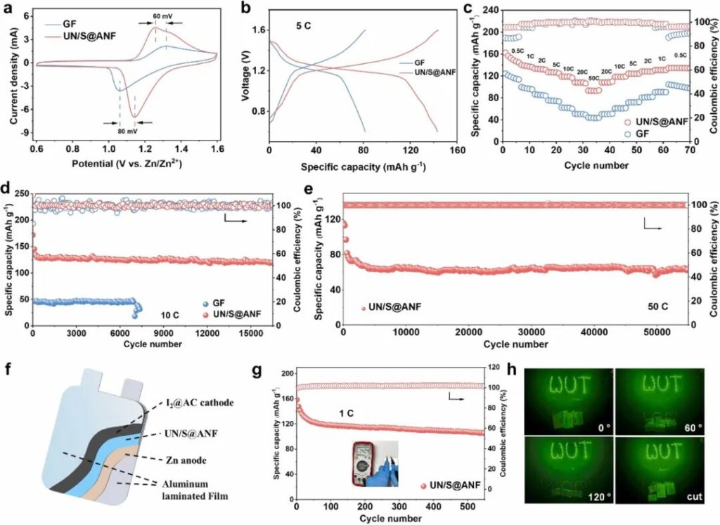 图5.采用不同隔膜的AZIB的电化学性能。(a)GF和UN/S@ANF隔膜在扫描速率为5mVs−1时的CV曲线。(b)5C时采用UN/S@ANF和GF隔膜的AZIB的电压-容量曲线。(c)采用UN/S@ANF和GF隔膜的AZIB的倍率性能。(d)10C时采用UN/S@ANF和GF隔膜的AZIB的循环性能。(e)50C时AZIB的长循环性能。(f)软包电池结构示意图。(g)Zn|UN/S@ANF|I2软包电池在1C下的循环性能。(h)软包电池在展开、折叠和切割状态下的正常工作照片。