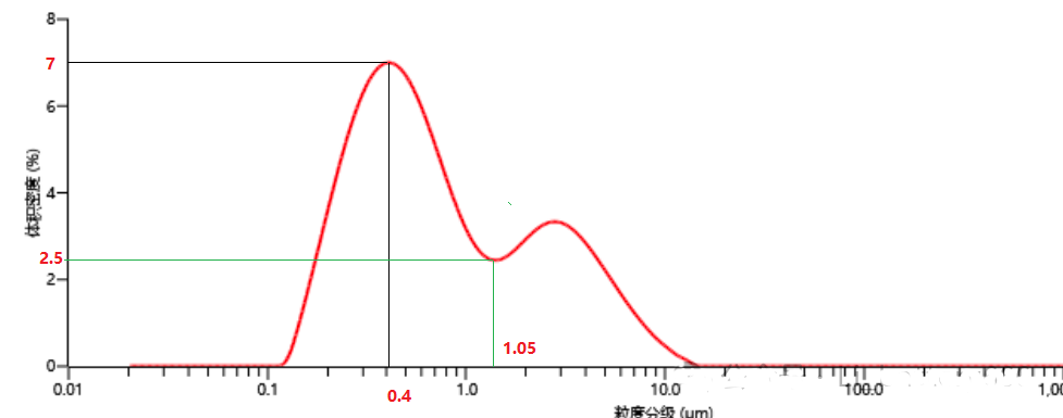 绿色的线对应的值表示:粒度为1.05μm的颗粒占整个粒子群的2.5%。