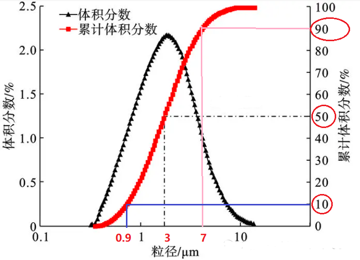 D10:表示小于此粒径的颗粒体积占总体积的10%,用图中蓝色线条所示,即小于0.9μm的颗粒占总颗粒体积的10%。