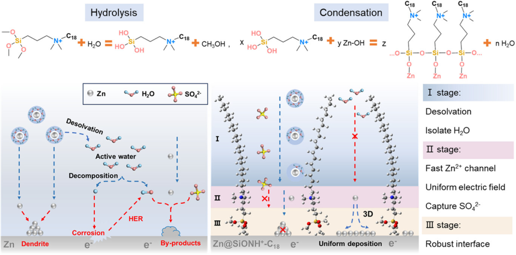 水作为离子传输介质和寄生电化学引发剂的双重功能,给水系电解液中的锌负极带来了难以调和的界面困境。本文提出了一种分层优化策略,整合了疏水屏蔽和阳离子调控双重协同机制,并通过烷基化硅烷基季铵盐(Zn@SiONH+-C18)对锌负极进行功能化来实现。疏水十八烷基链可抑制水诱导的腐蚀和析氢,而─NH4+基团通过静电排斥效应增强Zn2+的沉积动力学,并锚定SO42-以减轻钝化反应。同时,具有交联Si-O-Si网络的硅氧烷衍生的Si-O-Zn骨架确保了界面的机械稳定性,从根本上抑制了枝晶的形成。因此,Zn@SiONH+-C18对称电池在1mAhcm−2下表现出超过3400小时(1mAcm−2)和2800小时(5mAcm−2)的出色循环性能。值得注意的是,Zn@SiONH+-C18阳极在55.6%放电深度(DOD,10mAhcm−2)下维持1000小时,并实现92%的高DOD(16.6mAhcm−2)。当与MnO2阴极配对时,全电池在10C下经过10,000次循环后仍保留63.2%的容量。这种特殊的分子层工程策略同时解决了枝晶抑制和界面稳定问题,为开发可持续水系金属电池建立了范例。