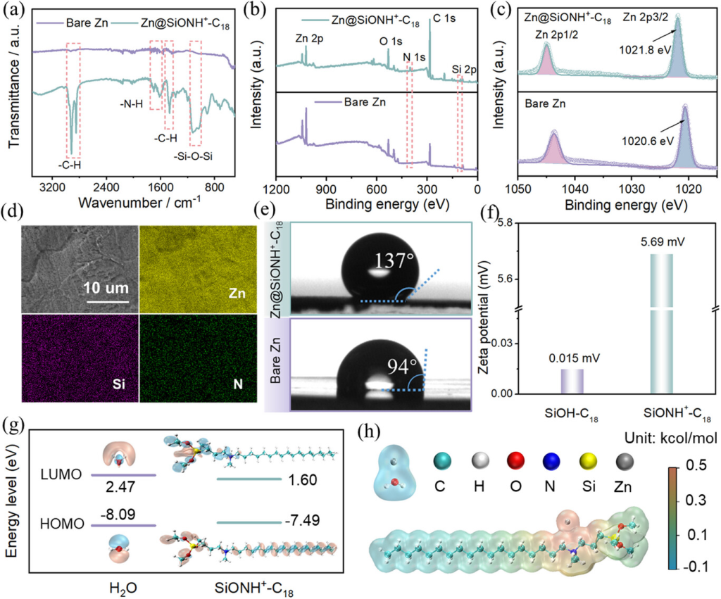 图1. a)裸露的Zn和Zn@SiONH+-C18电极的ATR-FTIR光谱。b)调查光谱和c)裸露的Zn和Zn@SiONH+-C18电极上的Zn2p光谱的XPS分析。d)Zn@SiONH+-C18的SEM图像和相应的EDS元素映射。e)2mZnSO4电解质在Zn@SiONH+-C18和裸露Zn上的接触角。f)SiONH+-C18和SiOH-C18分子的Zeta电位。g)H2O和SiONH+-C18分子的前线分子轨道能量。h)Zn2+-SiONH+-C18和Zn2+-H2O的静电势映射。