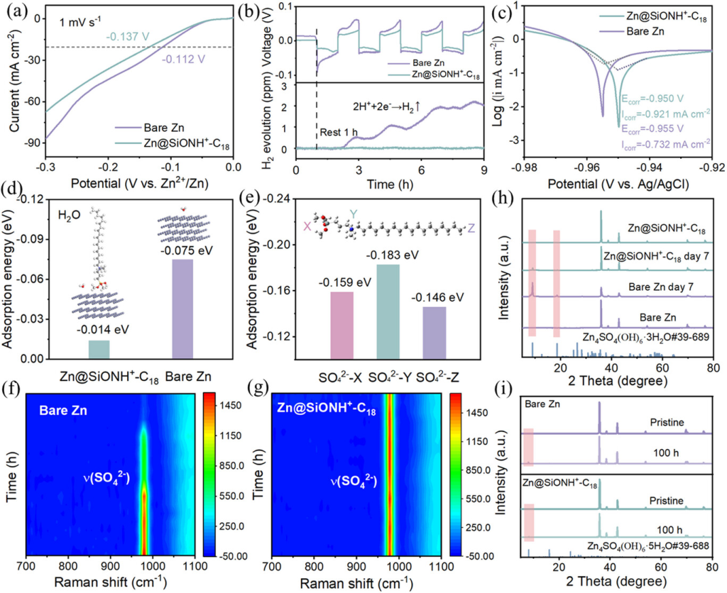 图2. a)Zn@SiONH+-C18和裸Zn在1mVs−1时的LSV曲线。b)1mAcm−2时的Zn沉积/剥离曲线以及裸Zn和Zn@SiONH+-C18的相应原位DEMS信号。c)三电极体系中1mVs−1时的Tafel曲线。d)吸附在Zn@SiONH+-C18和裸Zn表面的H2O分子的吸附能。e)SO42-在SiONH+-C18分子上X、Y、Z位置的吸附能。f)裸Zn和g)Zn@SiONH+-C18负极在2mAcm−2下循环20小时的拉曼光谱(700–1100cm−1)的二维对映图。h)在2mZnSO4中浸泡7天之前和之后的Zn@SiONH+-C18和裸Zn电极的XRD,i)在1mAcm−2和1mAhcm−2下循环100小时。