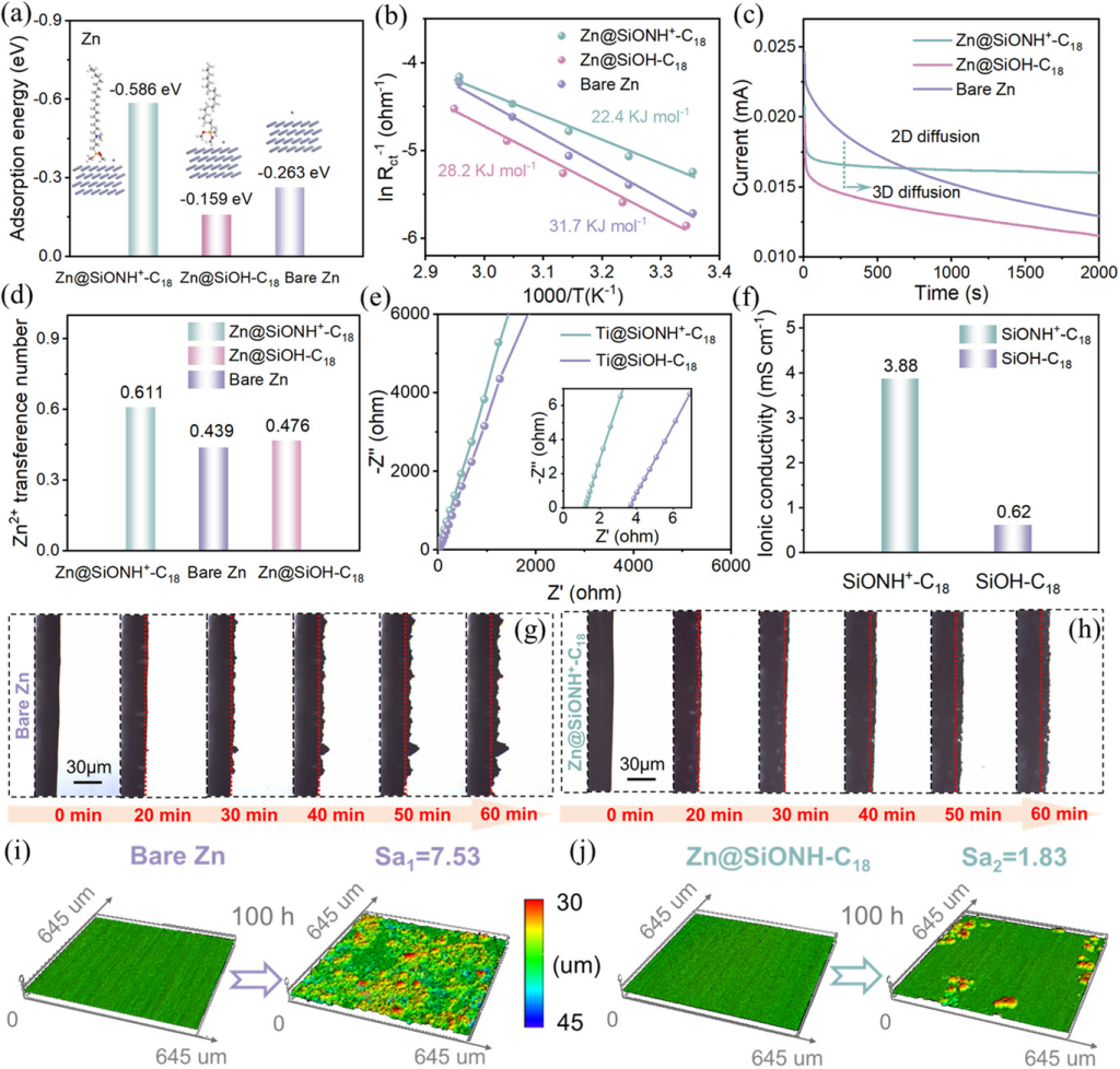 图3. a)Zn原子在Zn@SiONH+-C18和裸Zn表面的吸附能。b)Zn@SiONH+-C18和裸Zn的阿伦尼乌斯图和活化能。c)过电位为20mV时的计时电流法曲线。d)Zn2+迁移数比较。e)Ti@SiONH+-C18//GFD//Ti配置的Nyquist图。f)SiONH+-C18和SiOH-C18的离子电导率。g)裸Zn和h)Zn@SiONH+-C18在2mAcm−2和1mAhcm−2下的镀锌原位光学显微镜图。i)裸Zn和j)Zn@SiONH+-C18在2.0mAcm−2下循环100小时前后的CLSM3D形貌图