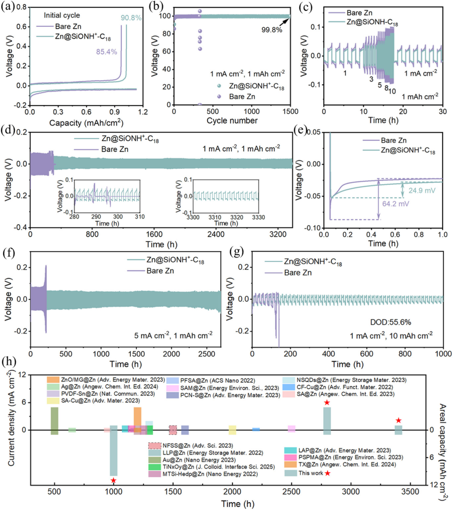 图4. a)初始电压容量图和b)Zn@SiONH+-C18和裸Zn负极在Zn//Cu电池中的库仑效率。c)1mAhcm−2下Zn//Zn电池从1到10mAcm−2的倍率性能。d)基于Zn@SiONH+-C18和裸Zn的Zn//Zn电池在1mAcm−2和1mAhcm−2下的长期循环和e)成核过电位。f)5mAcm−2和1mAhcm−2、g)1mAcm−2和10mAhcm−2下的Zn//Zn电池的恒电流循环。h)Zn@SiONH+-C18负极与报道的Zn负极的循环稳定性比较。