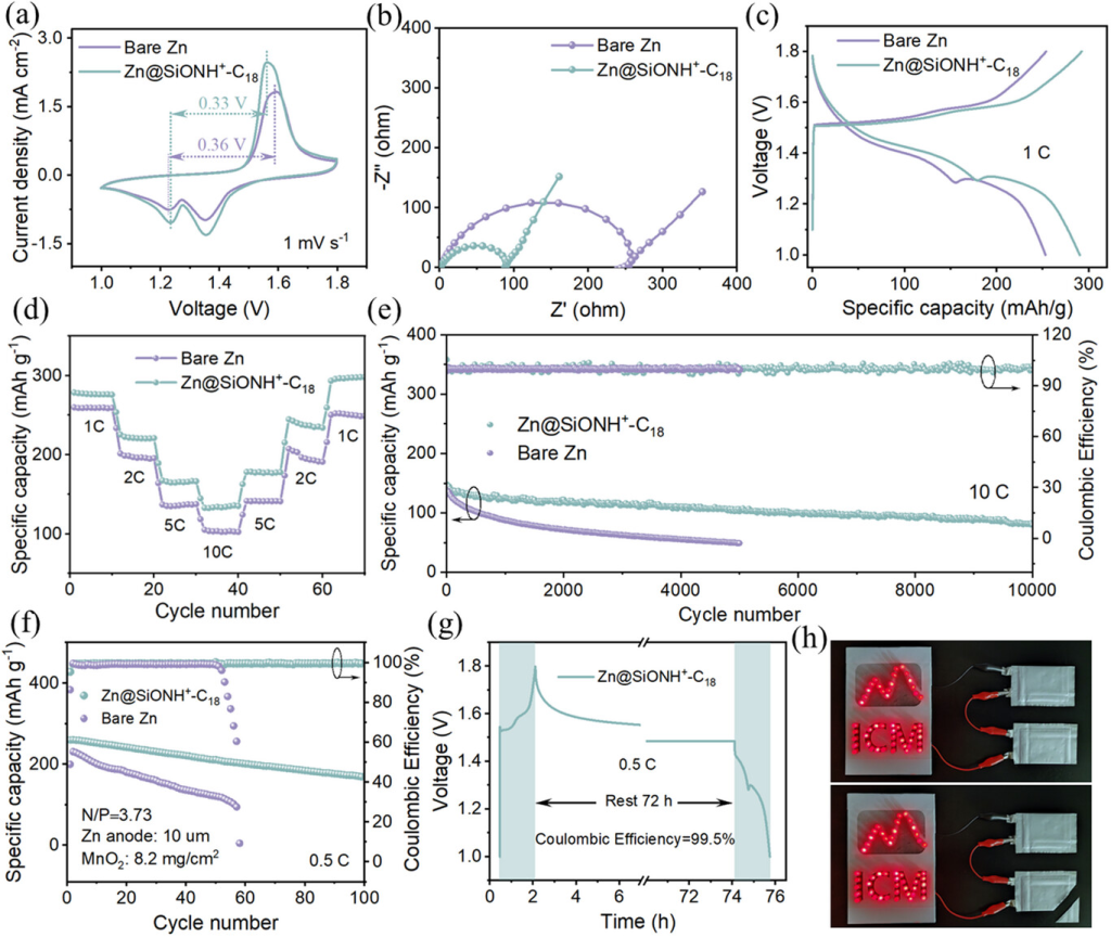 图5. 在2mZnSO4+0.1MnSO4电解液中,Zn//MnO2全电池中裸Zn和SiONH+-C18@Zn的电化学性能。a)1mV·s−1时的CV曲线。b)EIS光谱。c)1C时的恒电流充放电曲线。d)1C至10C的倍率性能评估。低N/P比下e)10C、f)0.5C时的长期循环性能。g)SiONH+-C18@Zn//MnO2电池静置72小时后的自放电性能。h)SiONH+-C18@Zn//MnO2电池在电源中的应用演示