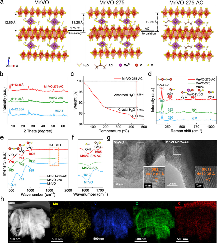 图1 MnVO、MnVO-275和MnVO-275-AC的结构和形貌表征。a)制备MnVO-275-AC的示意图。b)MnVO、MnVO-275和MnVO-275-AC的XRD。c)MnVO-275-AC的TGA曲线。d)MnVO、MnVO-275和MnVO-275-AC的拉曼光谱。e)MnVO、MnVO-275和MnVO-275-AC的FTIR光谱。f)FTIR光谱中选定区域的放大视图。g)MnVO和MnVO-275-AC样品的HRTEM图。h)MnVO-275-AC的TEM图和Mn、V、O和C的EDX映射。