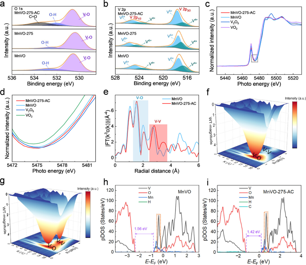 图2.MnVO和MnVO-275-AC的元素化学状态。a、b)MnVO、MnVO-275和MnVO-275-AC的a)O1s和b)V2p的XPS光谱。c)MnVO、MnVO-275-AC、V2O5和VO2的归一化VK边XANES光谱。d)归一化VK边XANES光谱的吸收边放大图。e)MnVO和MnVO-275-AC的VK边的k3加权FT-EXAFS。f-g)f)MnVO和g)MnVO-275-AC样品的3DWT-EXAFS。h)MnVO的pDOS。i)MnVO-275-AC的pDOS。