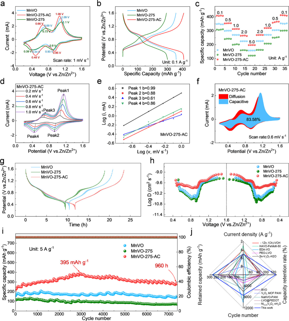 图3 MnVO、MnVO-275和MnVO-275-AC正极的电化学性能。a)以1mVs−1的扫描速率测得的CV曲线。b)在0.1Ag−1的电流密度下,MnVO、MnVO-275和MnVO-275-AC的GCD曲线。c)随着电流密度的增加,MnVO、MnVO-275和MnVO-275-AC的倍率性能。d)MnVO-275-AC正极的可变扫描速率CV曲线和e)b值的拟合图。f)0.6mVs−1时的容量分离曲线。g)MnVO、MnVO-275和MnVO-275-AC的GITT曲线,以及h)GITT测量期间的扩散系数。i)比较MnVO、MnVO-275和MnVO-275-AC在5Ag−1下的循环性能和相应的库仑效率,j)比较MnVO-275-AC正极与先前研究中报告的其他V基正极的电化学性能。
