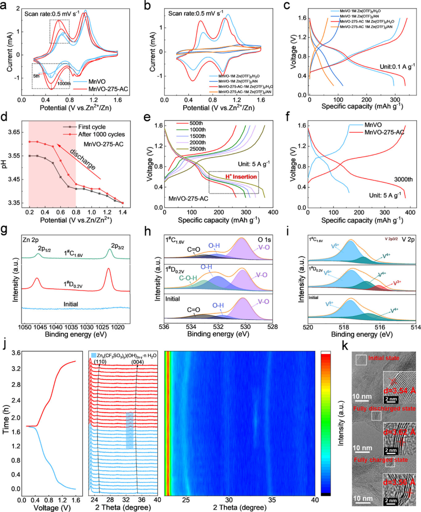 图4 MnVO-275-AC正极自适应存储机制研究。a)在第5次和第1000次循环后测试的MnVO和MnVO-275-AC的CV曲线。b)分别使用1mZn(OTF)2/H2O和1mZn(OTF)2/AN作为电解质测量的MnVO和MnVO-275-AC的CV曲线。c)分别使用1mZn(OTF)2/H2O和1mZn(OTF)2/AN作为电解质的MnVO和MnVO-275-AC电极的GCD曲线。d)在1000次循环之前和之后对MnVO-275-AC进行原位pH测试。e)在不同循环次数下测量的MnVO-275-AC电极的GCD曲线。f)经过3000次循环后测量的MnVO和MnVO-275-AC电极的GCD曲线。g-i)不同电压状态下MnVO-275-AC的g)Zn2p、h)O1s和i)V2p的非原位XPS光谱。j)0.2Ag−1时Zn//MnVO-275-AC的1D(中间)、2D(右)原位XRD光谱和相应的GCD曲线(左)。k)初始、完全放电和完全充电状态下MnVO-275-AC电极的HRTEM图。