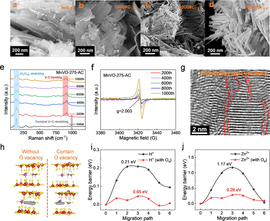 图5. MnVO-275-AC在循环过程中的形态和结构演变以及对离子扩散的相对影响。a)初始MnVO-275-AC正极和在电流密度为5Ag−1下经过b)1000、c)2000和d)3000次循环后的SEM图像。e)MnVO-275-AC正极在不同循环阶段的拉曼光谱。f)MnVO-275-AC正极在不同循环阶段的EPR光谱。g)1000次循环后MnVO-275-AC正极的HRTEM图像。h)晶格中有/无氧空位时H+/Zn2+迁移路径的比较DFT模型。i)有/无氧空位时H+的迁移能垒。j)有/无氧空位时Zn2+的迁移能垒。