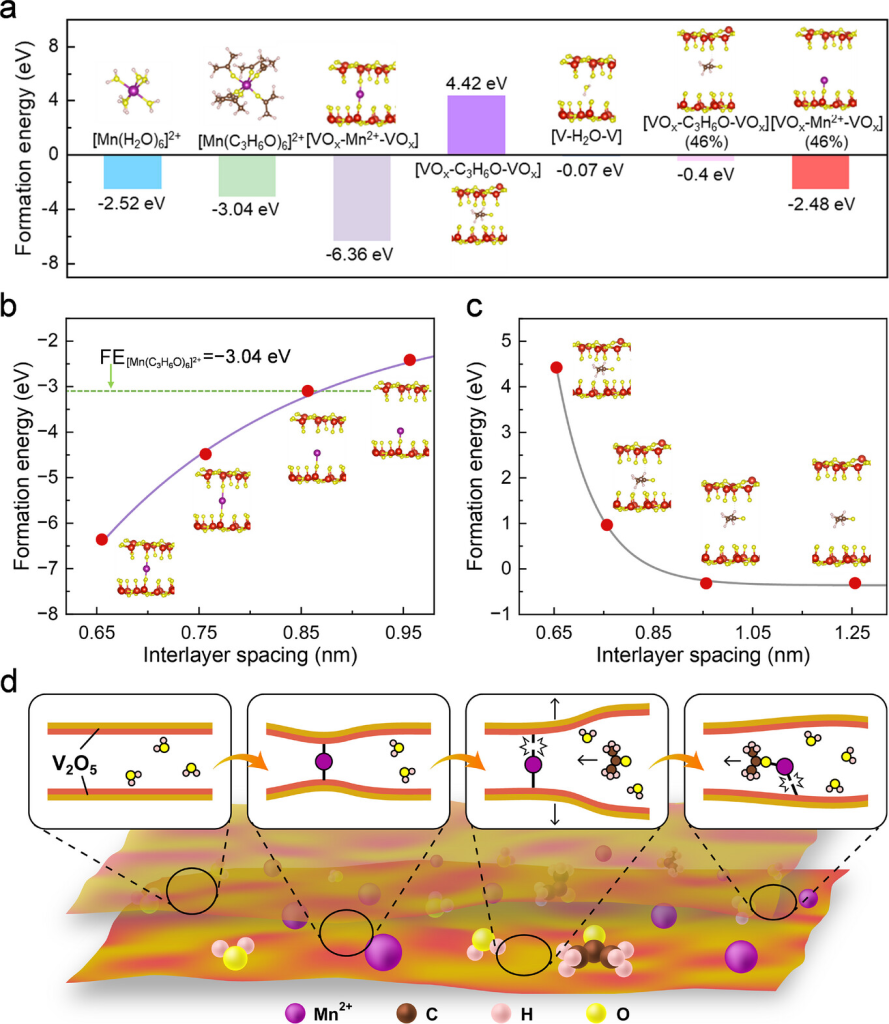 图6 自适应过程的物理机制。a)MnVO-275-AC中不同相互作用的形成能。b)Mn2+和VOx之间的形成能随层间距的变化。c)AC和VOx之间的形成能随层间距的变化。d)Mn2+、H2O、AC和VOx层之间相互作用的自适应过程物理模型示意图。