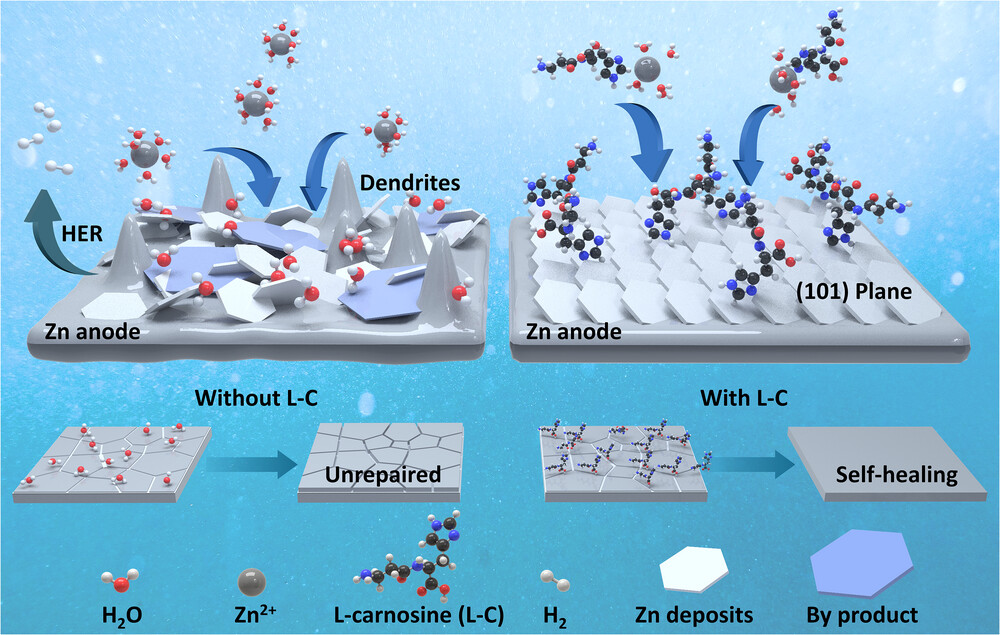 水系锌离子电池(AZIB)在电网规模储能方面前景广阔,但其存在由枝晶生长、析氢和腐蚀引起的锌负极不稳定性问题。本研究引入天然二肽L-肌肽(L-C) 作为电解液添加剂,以解决这些挑战,L-肌肽兼具离子螯合和锌吸附的双重功能。研究表明,L-C可以通过强配位键取代水分子来调节Zn2+溶剂化结构。同时,L-C可以优先吸附在锌表面,引导锌沿(101)面均匀沉积,并形成动态保护层,从而动态修复界面缺陷。这种自修复能力使短路的锌负极能够恢复超过2000小时的稳定循环,而预先划伤的表面在循环过程中也能完全恢复。这些协同机制使Zn||Zn对称电池实现了卓越的循环稳定性(1mAcm−2、1mAhcm−2时循环稳定性超过5400小时)和高倍率耐久性(5mAcm−2、5mAhcm−2时循环稳定性超过1100小时)。全电池与NH4V4O10(NHVO)正极配对,在5Ag−1电流密度下循环2000次后仍保留82.26%的容量,彰显了其实用可行性。仿生溶剂化-界面双调控策略为设计环保、高性能的AZIB提供了一种通用方法。