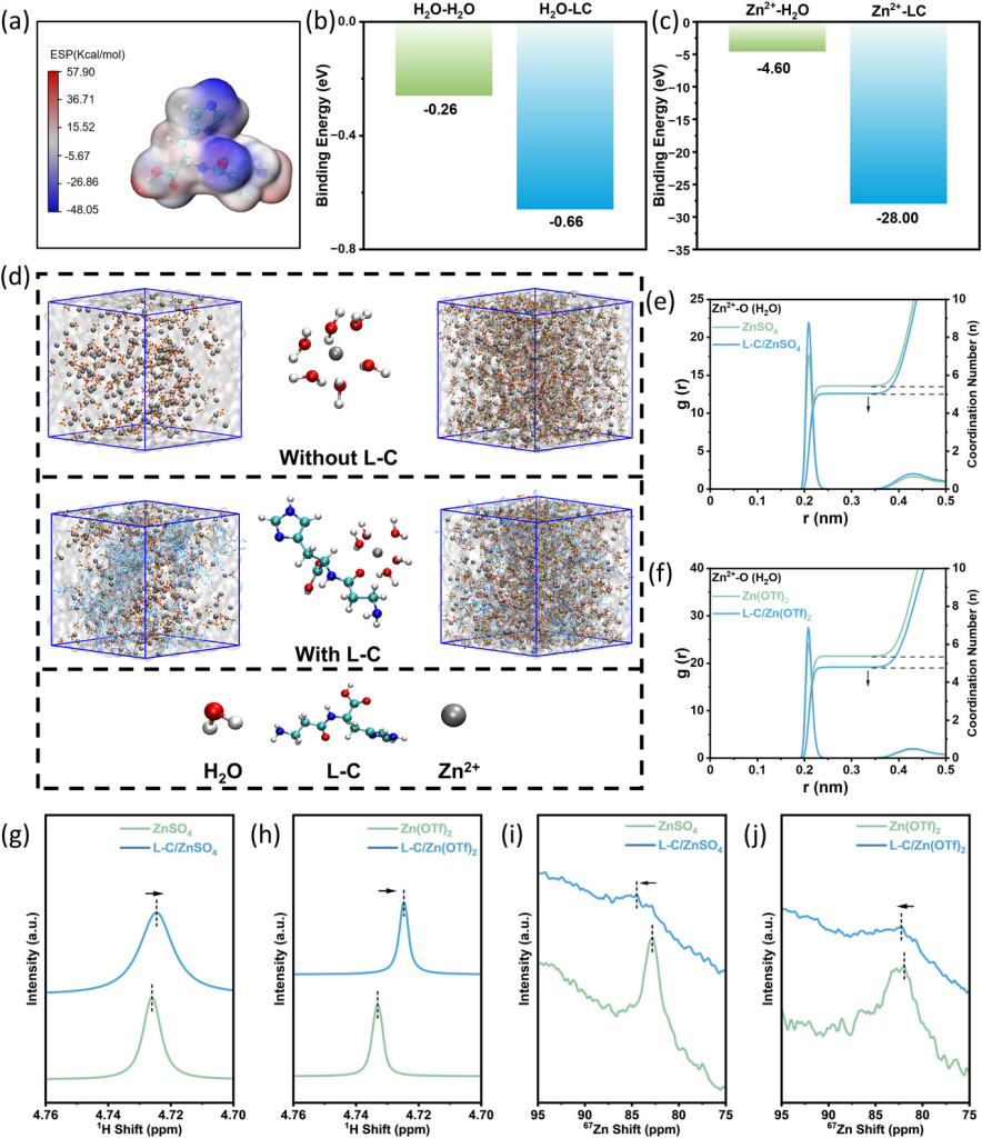 图1. a)L-C的ESP映射。b)Zn2+-H2O和Zn2+-L-C的结合能;c)H2O-H2O和H2O-L-C的结合能。d)四种电解液体系的MD模拟快照和水合Zn2+的局部溶剂化结构。e)ZnSO4和L-C/ZnSO4的模拟RDF;f)Zn(OTf)2和L-C/Zn(OTf)2的模拟RDF。g)ZnSO4和L-C/ZnSO4的1HNMR光谱;h)Zn(OTf)2和L-C/Zn(OTf)2的1HNMR光谱。i)ZnSO4和L-C/ZnSO4的67ZnNMR光谱;j)Zn(OTf)2和L-C/Zn(OTf)2的67ZnNMR光谱。