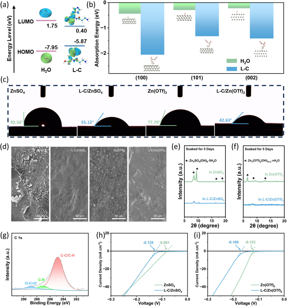 图2. a)H2O和L-C的LUMO和HOMO等值面。b)H2O和L-C在Zn(100)、(101)、(002)面上的吸附模式及相应的吸附能。c)四种电解液对锌负极的接触角测试。d)在不同电解液中浸泡5天的锌负极的SEM图像。在e)ZnSO4和L-C/ZnSO4;f)Zn(OTf)2和L-C/Zn(OTf)2中浸泡5天的锌负极的XRD图谱。g)在L-C/ZnSO4中浸泡的锌负极的C1sXPS光谱。h)ZnSO4和L-C/ZnSO4;i)Zn(OTf)2和L-C/Zn(OTf)2中的LSV曲线。