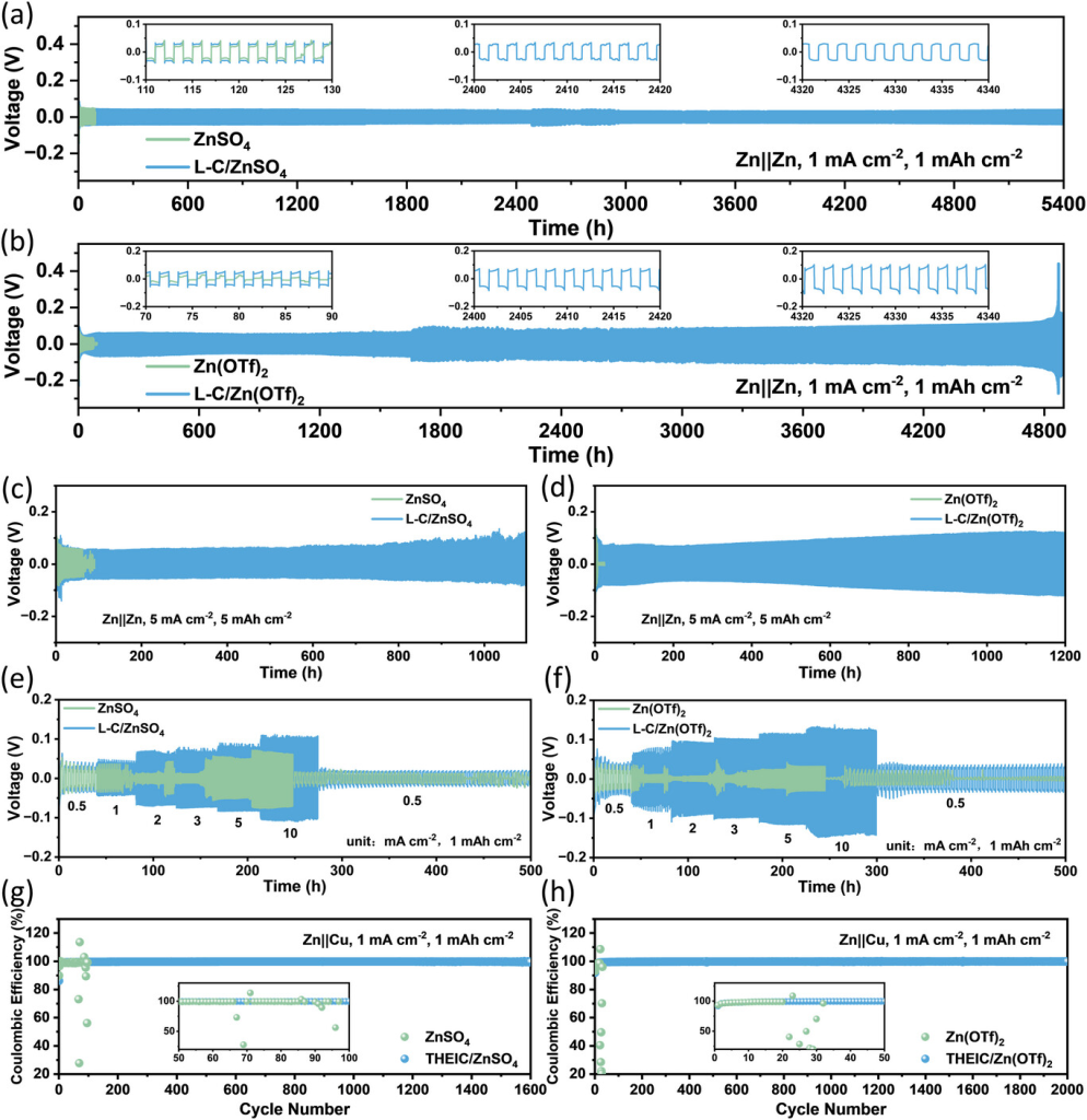 图3. 对称电池的循环性能,a)ZnSO4和L-C/ZnSO4;b)Zn(OTf)2和L-C/Zn(OTf)2在1mAcm−2和1mAhcm−2下的性能。对称电池的循环性能,c)ZnSO4和L-C/ZnSO4;d)Zn(OTf)2和L-C/Zn(OTf)2在5mAcm−2和5mAhcm−2下的性能。Zn||Zn对称电池的倍率性能,e)ZnSO4和L-C/ZnSO4;f)Zn(OTf)2和L-C/Zn(OTf)2在0.5至10mAcm−2的不同电流密度和1mAhcm−2的比面积容量下的性能。Zn||Cu半电池的循环性能,g)ZnSO4和L-C/ZnSO4;h)1mAcm−2和1mAhcm−2下的Zn(OTf)2和L-C/Zn(OTf)2。