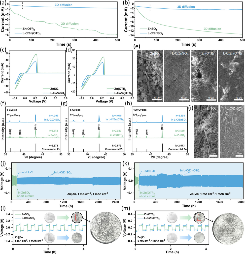 图4. Zn||Zn对称电池的CA曲线,其中a)ZnSO4和L-C/ZnSO4;b)Zn(OTf)2和L-C/Zn(OTf)2,过电位为−150mV。Zn||Cu半电池的循环伏安图,其中c)ZnSO4和L-C/ZnSO4;d)Zn(OTf)2和L-C/Zn(OTf)2。e)四种不同电解液中Zn负极经过5次循环后的SEM图像。四种不同电解液中Zn负极经过5次循环后的XRD图案f)ZnSO4和L-C/ZnSO4;g)Zn(OTf)2和L-C/Zn(OTf)2。h)ZnSO4和L-C/ZnSO4电解液中Zn负极经过100次循环后的XRD图案和i)SEM图像。j)L-C/ZnSO4和k)L-C/ZnSO4电解液中短路后锌负极的循环性能。表面带有字母“L”的锌负极的循环性能:l)ZnSO4和L-C/ZnSO4;m)Zn(OTf)2和L-C/Zn(OTf)2电解液循环10次,插图显示了循环前后锌负极的相应光学图