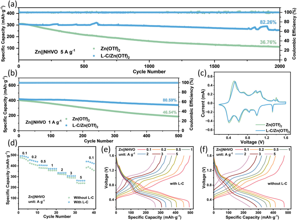图5. Zn||NHVO全电池在电流密度a)5Ag−1;b)1Ag−1下的长期循环性能。c)扫描速率为0.2mVS−1时第二次循环的循环伏安图。d)Zn||NHVO全电池在两种不同电解液中的倍率性能。e)含L-C和f)不含L-C的Zn||NHVO全电池在0.1至5Ag−1不同电流密度下的充放电曲线。