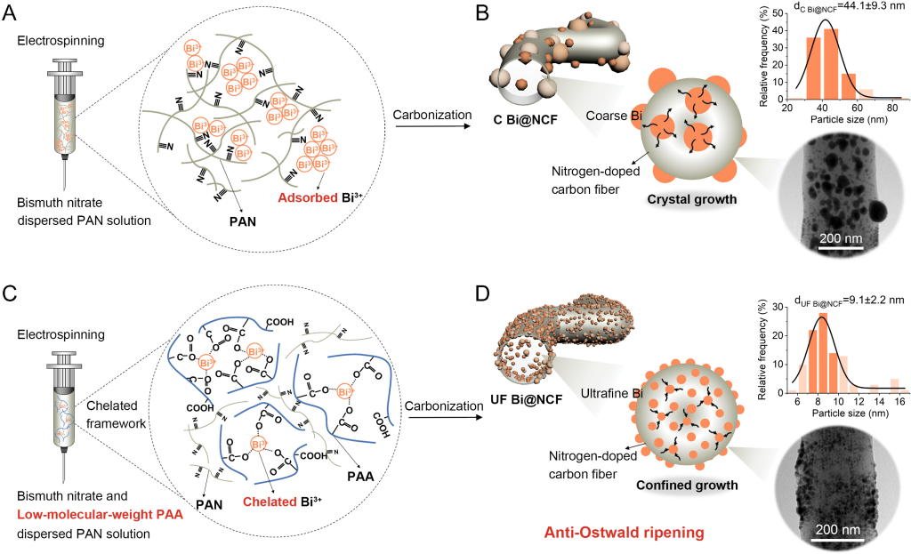 图1. 螯合诱导的抗奥斯特瓦尔德熟化机制和UFBi@NCF上Bi晶体的受限生长。(A)代表性PAN/Bi(NO3)3电纺丝前驱体溶液中元素成分示意图。(B)碳化后CBi@NCF复合材料的粒度分布和形态结构。(C)改性PAA/PAN/Bi(NO3)3电纺丝前驱体溶液中元素成分示意图。(D)螯合辅助碳化后UFBi@NCF复合材料的粒度分布和形态结构