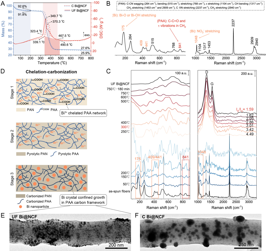 图2. 电纺双碳复合材料的热力学稳定性和PAA添加剂形成的螯合结构的原位拉曼分析。(A)电纺CBi@NCF和UFBi@NCF复合材料在空气中从环境温度到800°C的TGA-DSC曲线。(B)初纺UFBi@NCF前体纤维在波数范围80至900和1,000至3,300cm−1的拉曼光谱。(C)在相当于管式炉热处理的碳化条件下对UFBi@NCF复合材料进行原位高温拉曼光谱研究。(D)示意图显示了Bi晶体在PAA碳骨架中的受限生长以及低分子量PAA添加剂诱导的螯合碳化机制。(E)单根UFBi@NCF纳米纤维的高分辨率TEM图。(F)单个CBi@NCF纳米纤维的高分辨率TEM图。