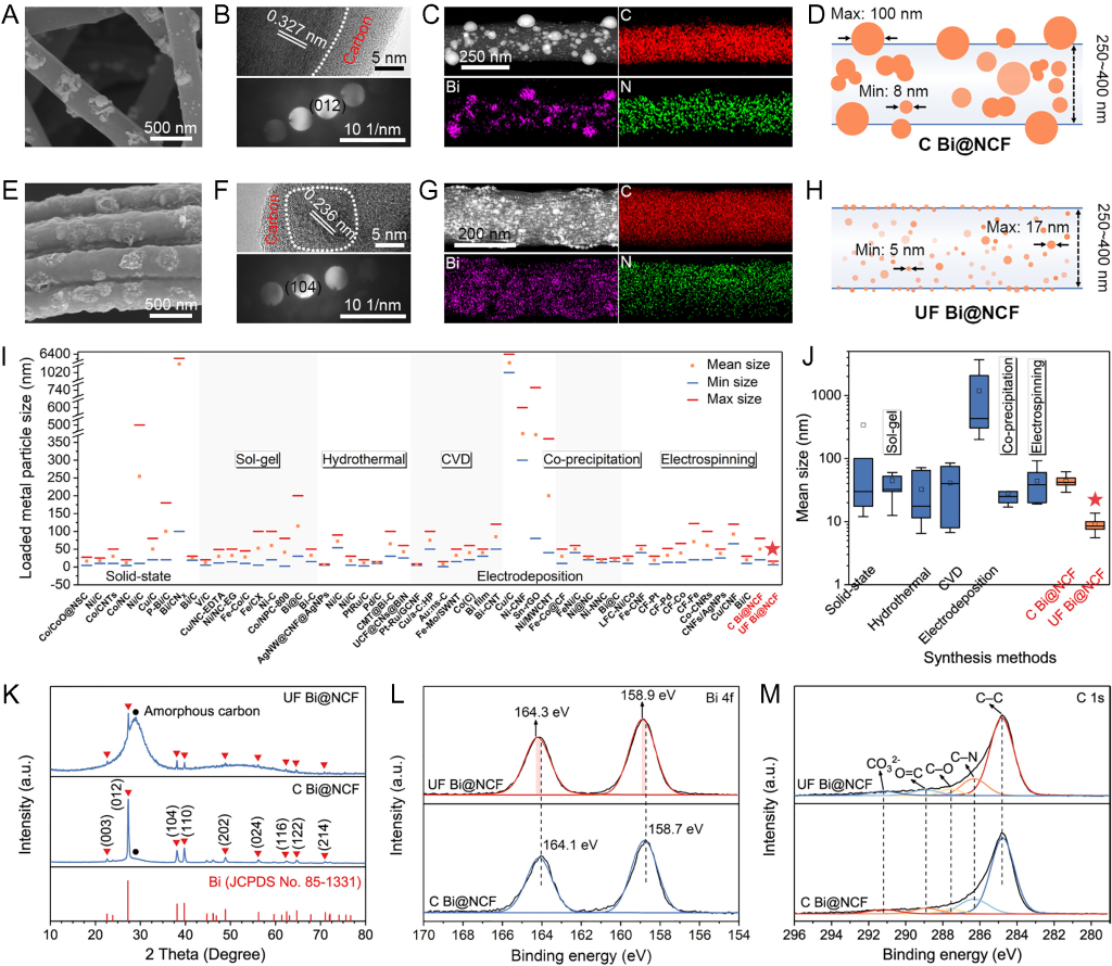 图3. 粒度特性研究比较不同技术合成的金属-碳复合材料。(A)CBi@NCF复合材料的低倍SEM图。(B)CBi@NCF复合材料的晶格条纹和相应的CBED衍射图。(C)CBi@NCF复合材料中Bi、C和N的高角度环形暗场扫描TEM图像和EDS元素映射。(D)CBi@NCF复合材料中最大和最小负载Bi晶体的示意图。(E)UFBi@NCF复合材料的低倍SEM图。(F)UFBi@NCF复合材料的晶格条纹和相应的CBED衍射图。(G)UFBi@NCF复合材料中Bi、C和N的高角度环形暗场扫描TEM图和EDS元素映射。(H)UFBi@NCF复合材料中Bi晶体最大和最小负载量的示意图。(I)不同技术获得的金属-碳复合材料的粒度分布比较。(J)不同技术获得的金属-碳复合材料的平均粒度箱线图。(K)CBi@NCF和UFBi@NCF复合材料的XRD。(L和M)CBi@NCF和UFBi@NCF复合材料的XPS。(L)Bi4f高分辨率光谱。(M)C1s高分辨率光谱。