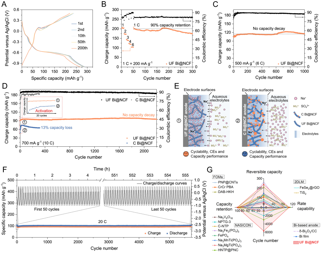 图4. UFBi@NCF电极在ASIB中的储钠性能。(A)UFBi@NCF负极在0.5C电流速率下的恒电流充放电曲线。(B)UFBi@NCF负极在不同电流速率(1C=200mAg−1)下的倍率性能和相应的CE。(C)UFBi@NCF负极在6C电流速率下的长期循环性能和CE。(D)UFBi@NCF和CBi@NCF负极在10C电流速率下的长期循环性能和CE,插图显示了前20个循环期间的电极活化过程。(E)UFBi@NCF和CBi@NCF负极在电化学过程中的表面结构示意图,解释了在初始循环中观察到的活化差异。(F)UFBi@NCF负极的超长循环稳定性和相应的充放电曲线。(G)ASIB类似储钠负极材料的循环性能、倍率性能和可逆容量比较。