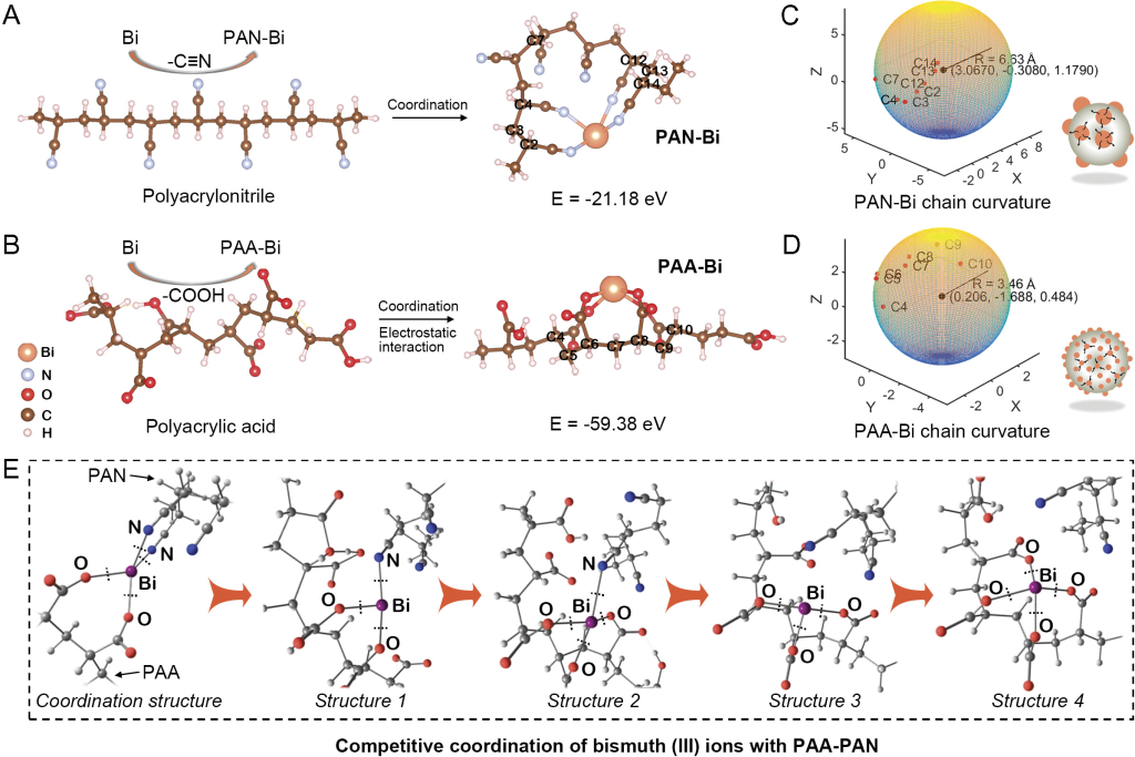 图5. PAN/Bi(NO3)3和PAA/PAN/Bi(NO3)3前驱体体系的结合能分析及分子模拟。(A)基于DFT计算的PAN/Bi(NO3)3前驱体体系的理论结合能。(B)基于DFT计算的PAA/PAN/Bi(NO3)3前驱体体系的理论结合能。(C)PAN-Bi链曲率的球面拟合分析。(D)PAA-Bi链曲率的球面拟合分析。(E)PAA/PAN/Bi(NO3)3前驱体体系的ReaxFF分子动力学模拟。