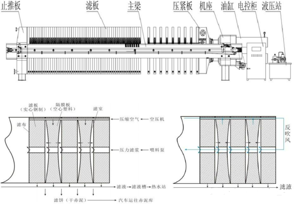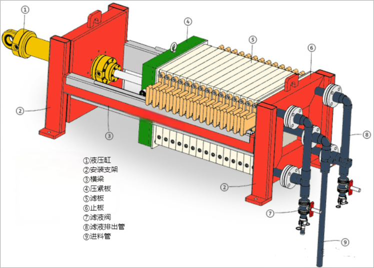 主要结构:隔膜式压滤机主要由液压装置、过滤装置、进出料排出系统、洗涤/卸料装置、气控系统、电气控制系统等组成