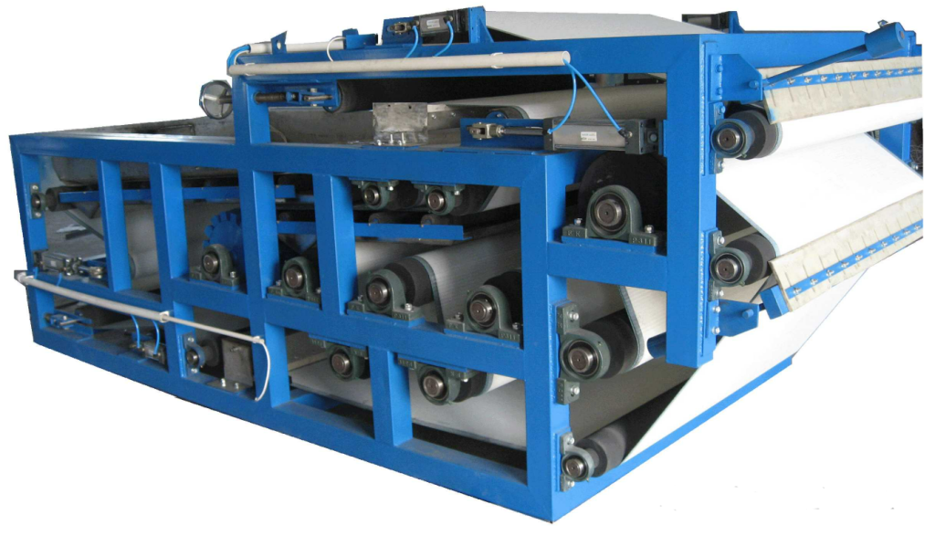 结构特点:由两条滤带夹持物料,通过辊压装置连续挤压脱水。