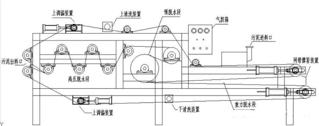 主要结构:带式压滤机主要由驱动装置、机架、压榨辊、上滤带、下滤带、滤带张紧装置、滤带清洗装置、卸料装置、气控系统、电气控制系统等组成