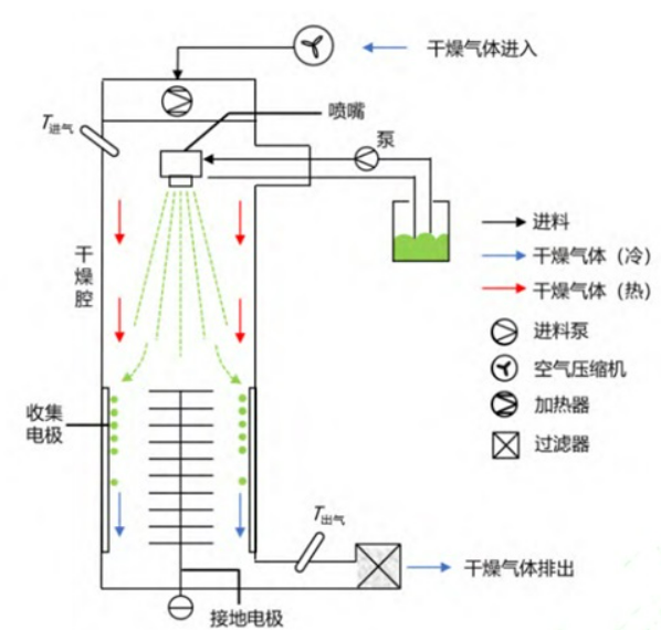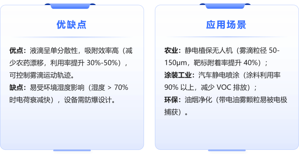 结构与原理:核心部件:高压电源(5-30kV)+带电荷喷嘴,液体经喷嘴时带电,在静电斥力与空气阻力作用下雾化成带电荷液滴。