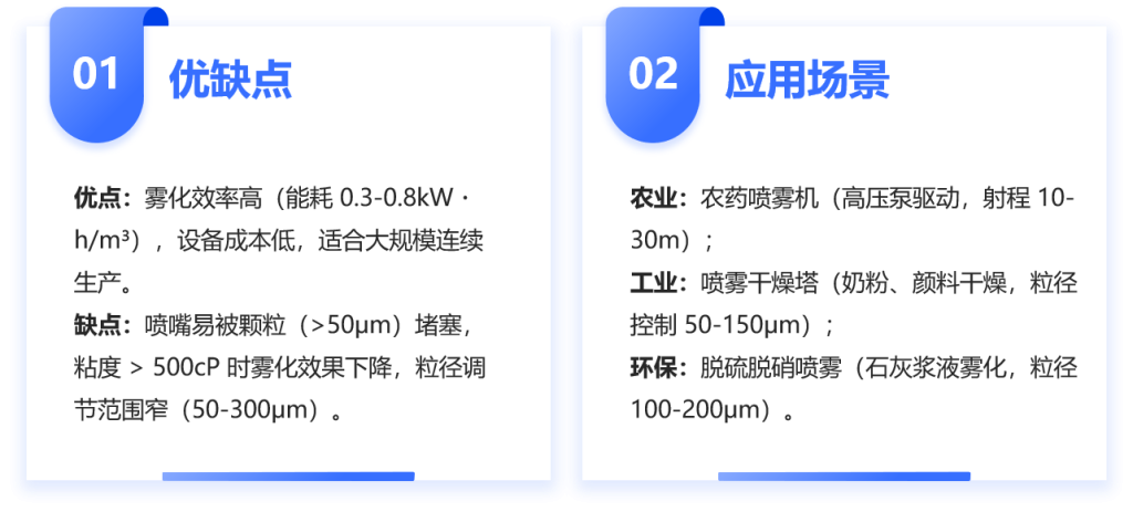 执行单元:单流体喷嘴(依靠液体压力雾化)或二流体喷嘴(液体 + 压缩空气);