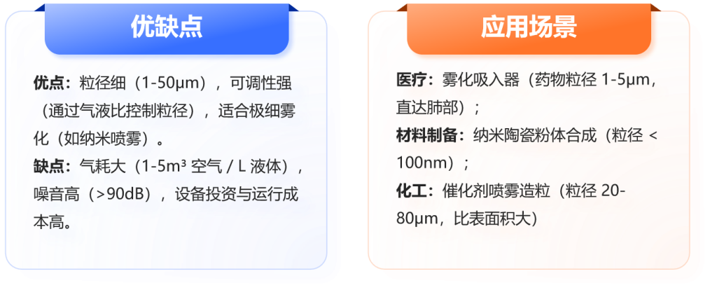 结构与原理:核心部件:内管(液体)+外管(压缩空气 / 蒸汽),液体与气体在喷嘴出口处(流速 300-1000m/s)混合,靠高速气流剪切力雾化。