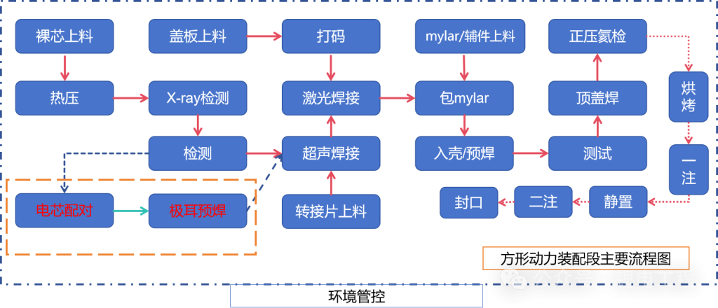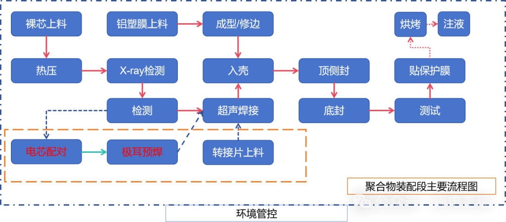 聚合物电芯(软包电芯)装配段的工艺流程,核心是围绕 “极片预处理→电芯成型→铝塑膜封装→电解液注入→活化稳定→性能检测” 六大核心环节,其设备需适配聚合物电芯轻薄、无金属外壳、铝塑膜封装的特性,需严格控制环境(低湿度、无尘)和工艺参数(精度、温度、压力),确保电芯的安全性、一致性和性能稳定性。