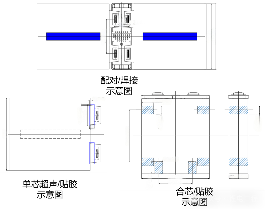 主要用于方形铝壳电池的极组装配工序,包含热压机、单极组检测机、极耳保护片超声波焊接机、盖板极耳激光焊接机、包膜热熔贴胶机、入壳预焊机、盖板铝壳激光封口焊接机和极组物流线,完成极组热压、检测、极耳与保护片焊接、极耳与盖板激光焊、入壳预焊、盖板铝壳激光封口焊接等工艺过程。