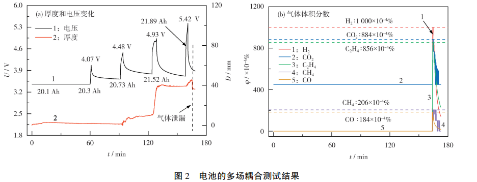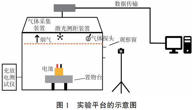 该系统主要由3个部分组成:精确控温防爆箱[植入箱体内的气体分析仪能精确地检测H2、CO、CH4和C2H4等气体的浓度变化]、充放电测试仪和激光位移测距采集系统。