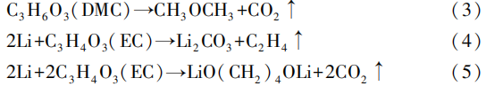 测试过程还发现,H2是最先被探测到的气体;在H2被检测到的9s后,检测到 CO,CO在短时间内达到184×10-4%的峰值;之后,再逐渐检测到C2H4和CH4等易燃气体和CO2,且CO2的最大值高达884×10-4%。这些气体的产生,主要是电解液的热分解、还原分解及SEI膜的分解等所致,代表性的过程如式(3) -(5)所示。特别重要的是,H2由于具有很高的逃逸速率,在电池未完全泄压之前即可被探测到,在应用上可利用该特征,在电池热蔓延发生前,及时启动消防或冷却装置,可防止热失控电池的热蔓延。