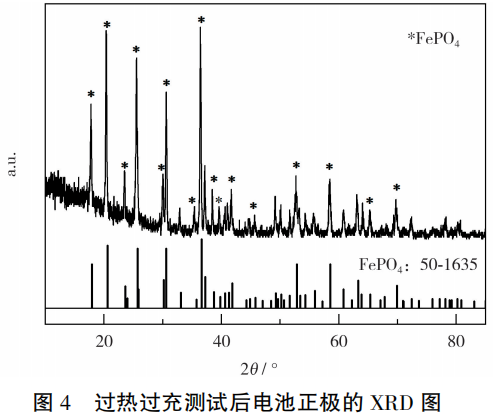 取出测试后的电池正极进行XRD测试,结果见图4。从图4可知,正极的衍射峰与FePO4的衍射峰完全一致,原因是在过充电状态下,LiFePO4中的Li+已基本脱出。